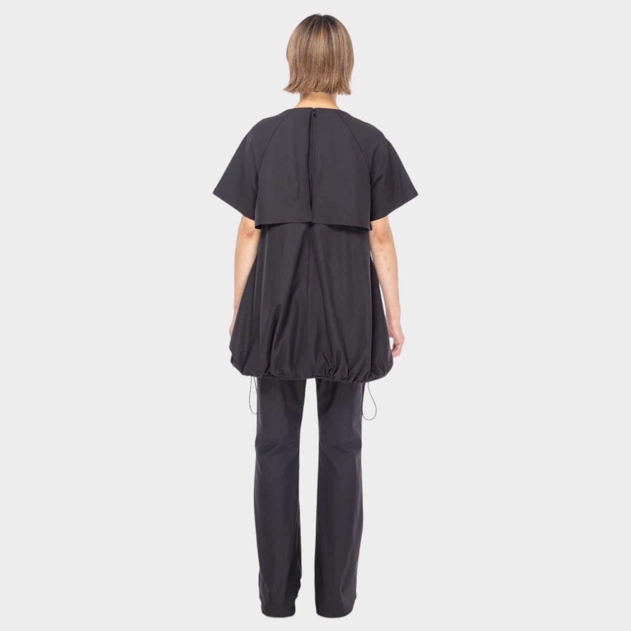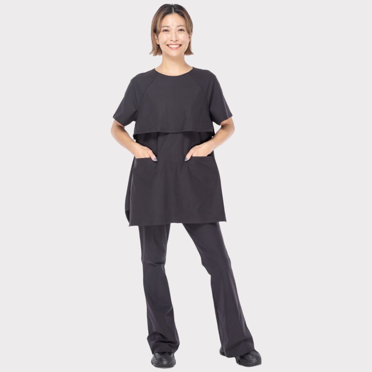 スリムフレアパンツは脚長効果と脚痩せ効果を出すために、シルエットにこだわり、身体の肉感を拾わないように硬過ぎず、柔らかすぎない生地です。